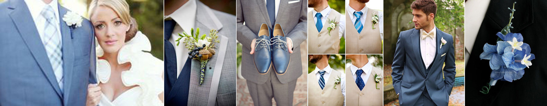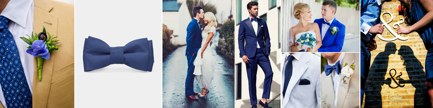 Trendem ostatnich lat stały się niebieskie i granatowe garnitury, więc ze stylizacją Pana Młodego nie ma największego problemu. Z dodatków możemy wybrać między muszkami i krawatami w niebieskim kolorze, butonierką a poszetką pasującą do wiązanki Panny Młodej, niebieskimi sznurówkami lub skarpetkami. Tu również nie można przesadzić z ilością błękitu. Ważne by strój odpowiednio zrównoważyć stonowanym kolorem (biała koszula, szare buty, szary pasek). W letnie dni doskonale będzie wyglądał jasny garnitur połączony z małymi mocnymi akcentami w postaci muszki i sportowych tenisówek. Musimy jednak pamiętać, że taka stylizacja pasuję tylko do luźnego charakteru uroczystości.